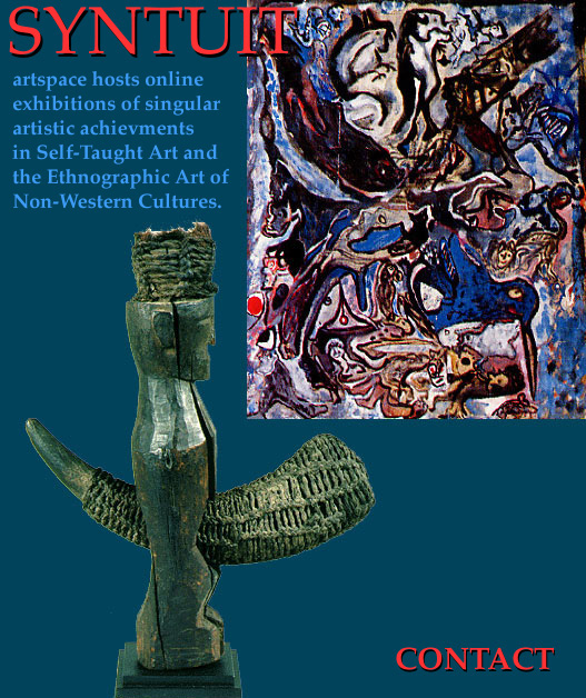 Left: Batak Pagar figure, Sumatra, late 19th century, 18 inches, wood, buffalo horn, fibre Right: Leonard Daley, Untitled, c1988, 30 x 24 inches, mixed media on canvas tarpaulin